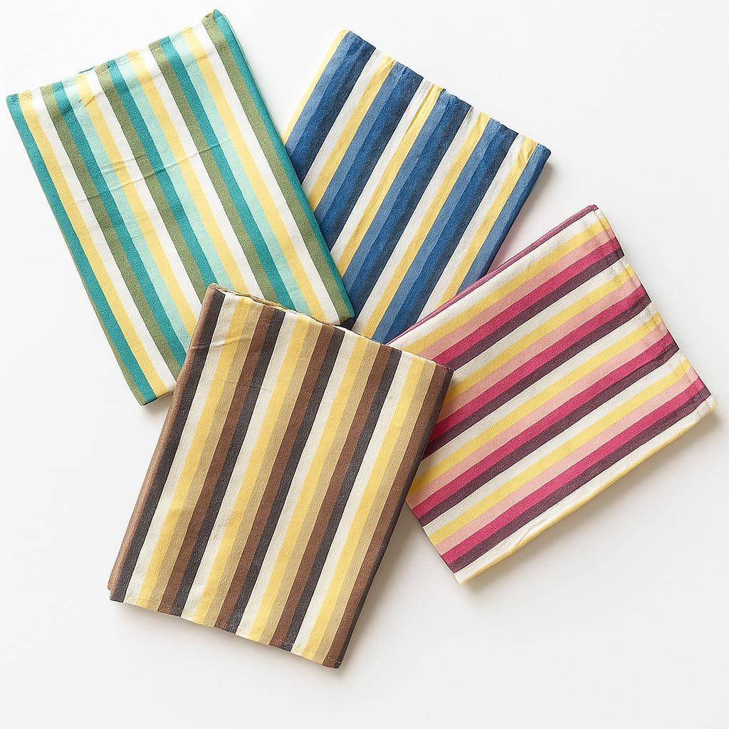 This bedsheet is constructed from pure cotton, featuring a 2-ply 20s count of fine, strong yarn combined with a single-ply thicker yarn for enhanced durability. Weighing 680 grams, it showcases a striped pattern in blue, red, green, and brown, and measures 60 by 90 inches.